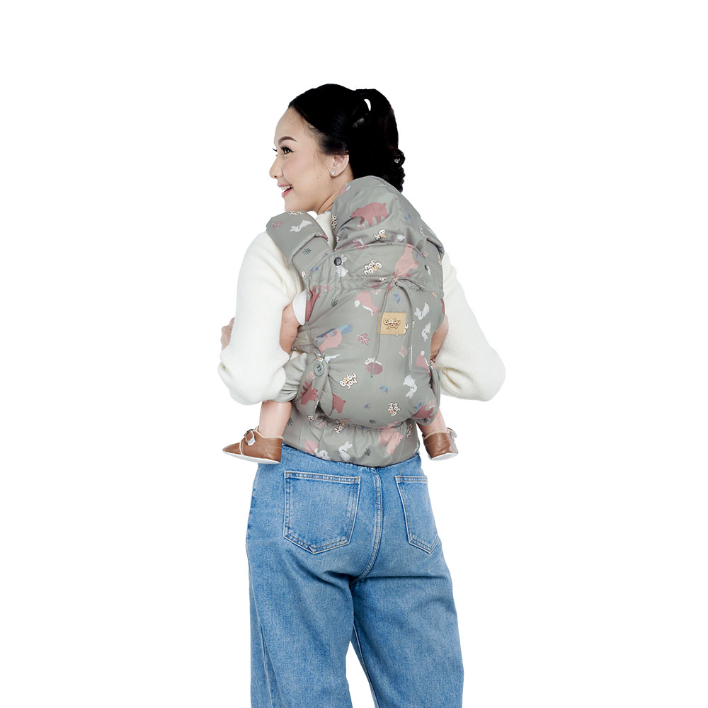 Panjang tali bahu dan lebar body panel dapat disesuaikan sesuai ukuran tubuh penggendong dan bayi. -