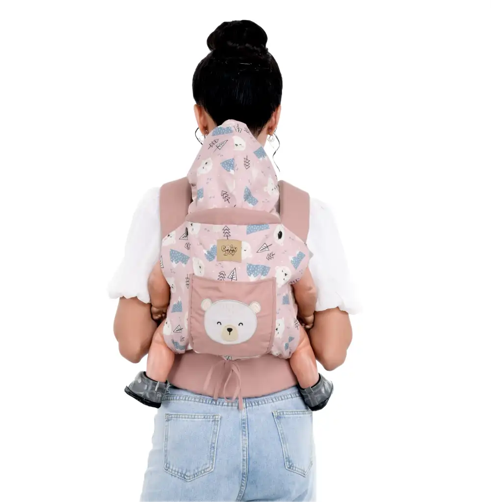 Back Carrying + Hoodie: Posisi gendong belakang yang aman & nyaman, dilengkapi hoodie penutup kepala yang bisa dilepas pasang.
